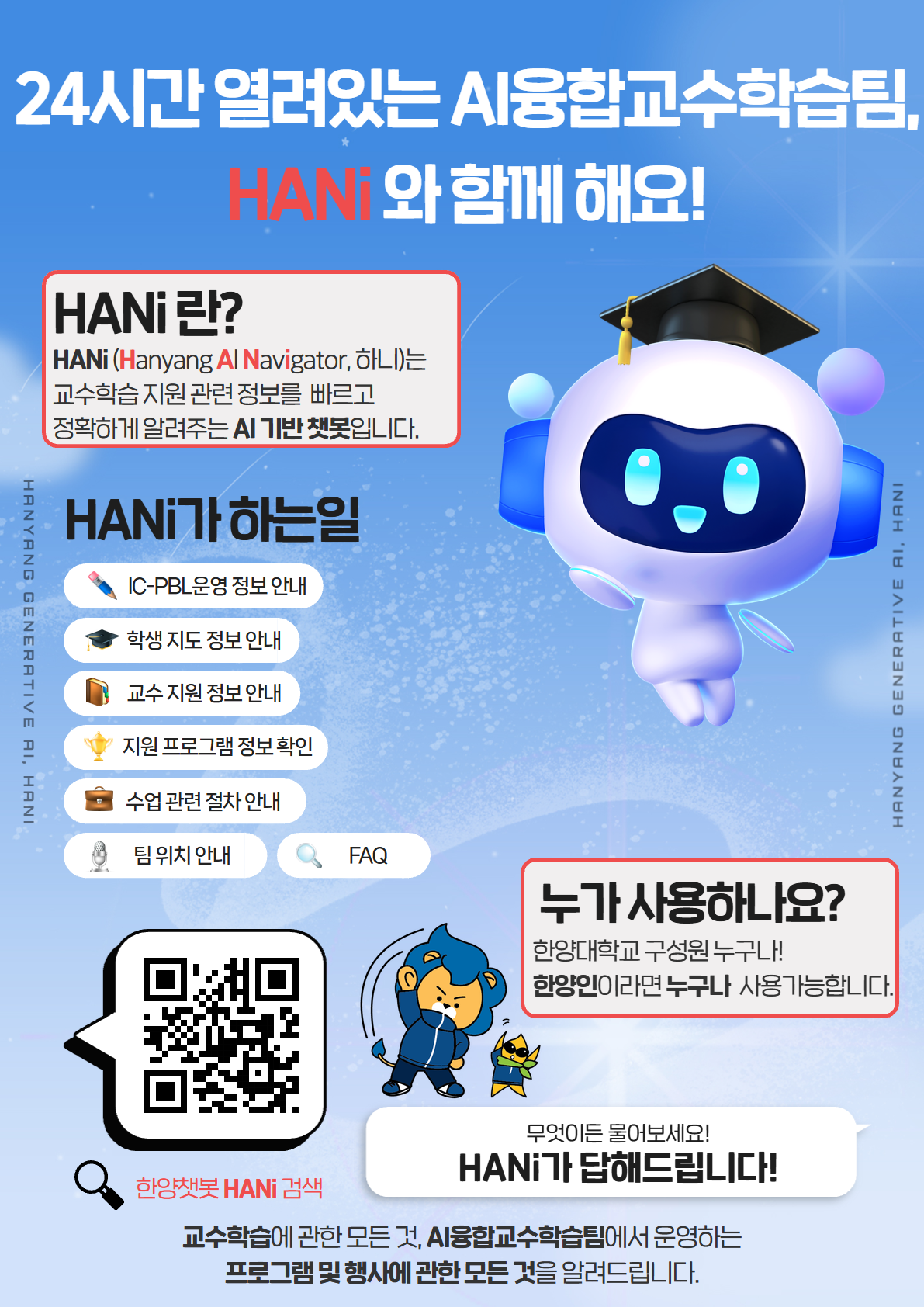 2. 하니(HANi)는 "24시간 열려 있는 교수학습지원"을 모토로 학습법, 교수지원 프로그램 등 교수학습 관련 정보를 신속하고 정확하게 안내하는 AI 챗봇입니다. 한양대학교 구성원이라면 누구나 웹을 통해 즉시 사용할 수 있습니다.